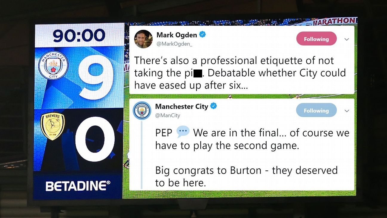 According to ESPN, News, POLL: Should Manchester City have eased off on Burton in 9-0 win?